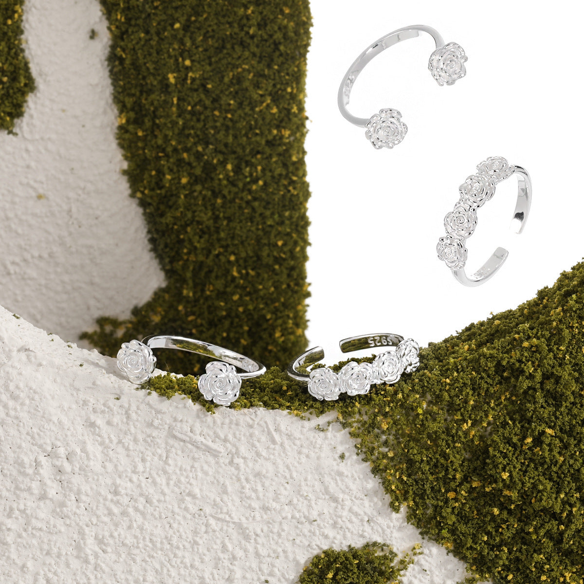 Women Beautiful Rose Flowers 925 Sterling Silver Adjustable Ring